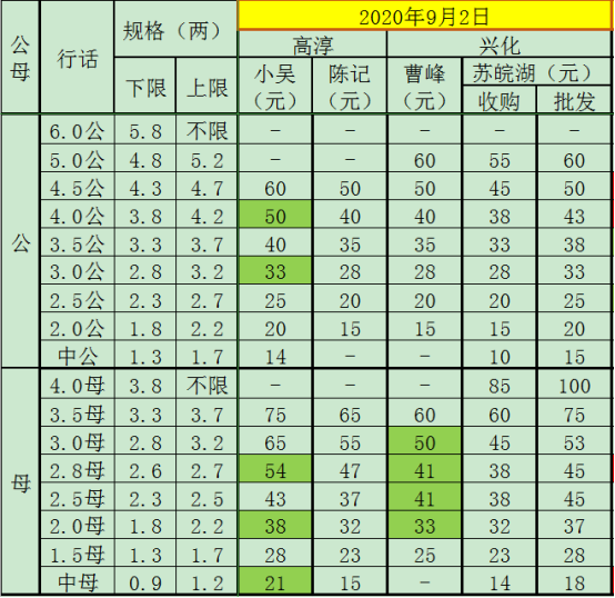 成蟹报价,各位老板根据情况选择销售。绿色标记为较前一日