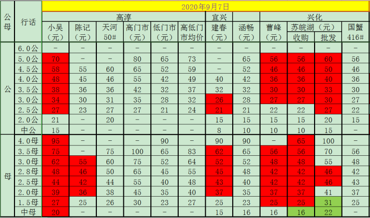 成蟹报价,各位老板根据情况选择销售。绿色标记为较前一日