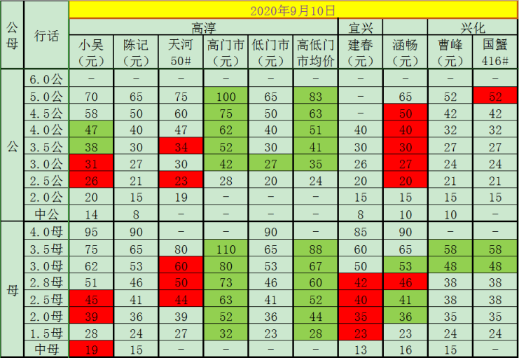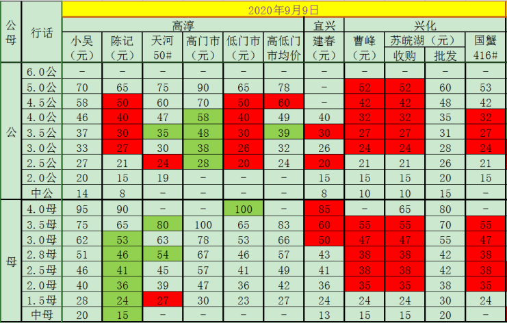 成蟹报价,各位老板根据情况选择销售。绿色标记为较前一日