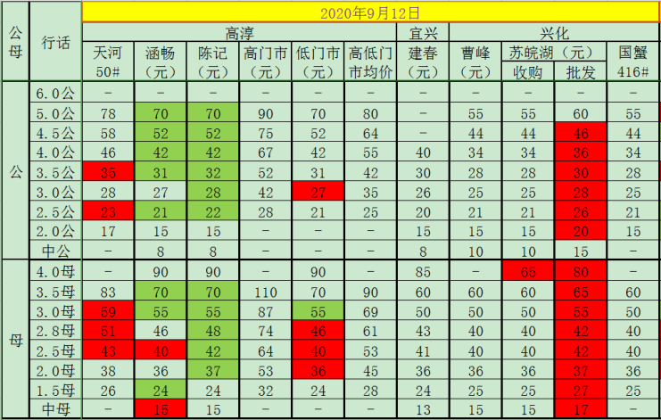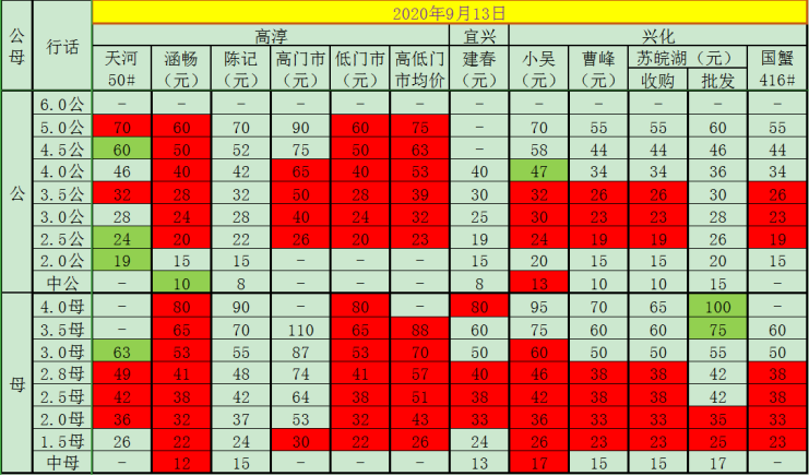 成蟹报价,各位老板根据情况选择销售。绿色标记为较前一日