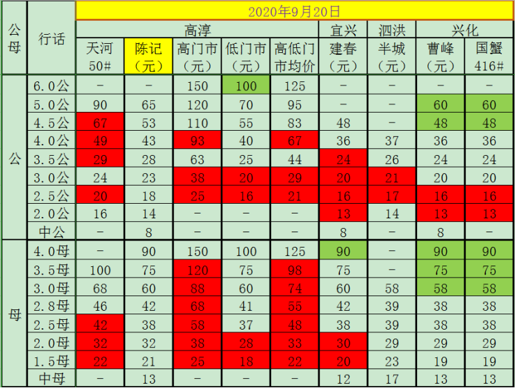 成蟹报价,各位老板根据情况选择销售。绿色标记为较前一日