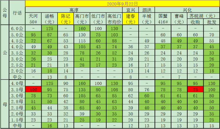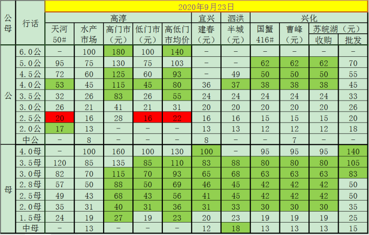 成蟹报价,各位老板根据情况选择销售。绿色标记为较前一日