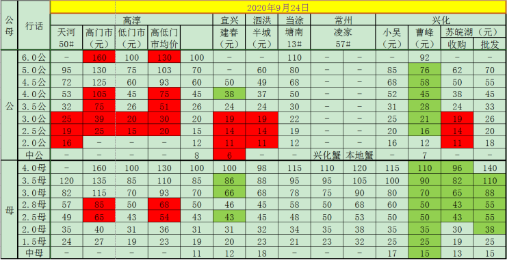 成蟹报价,各位老板根据情况选择销售。绿色标记为较前一日