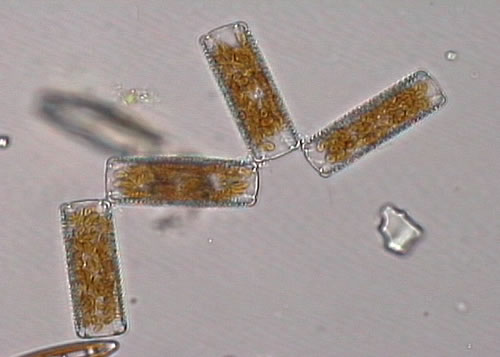 硅藻是一类具有色素体的单细胞植物,常由几个或很多细胞个体连结成各式各样的群体。硅藻的形态多种多样。 硅藻常用一分为二的繁殖方法产生。分裂之后,在原来的壳里,各产生一个新的下壳。盒面和盒底分别名为上、下壳面。壳面弯伸部分名壳套。上下壳套向中间伸展部分,称相连带。