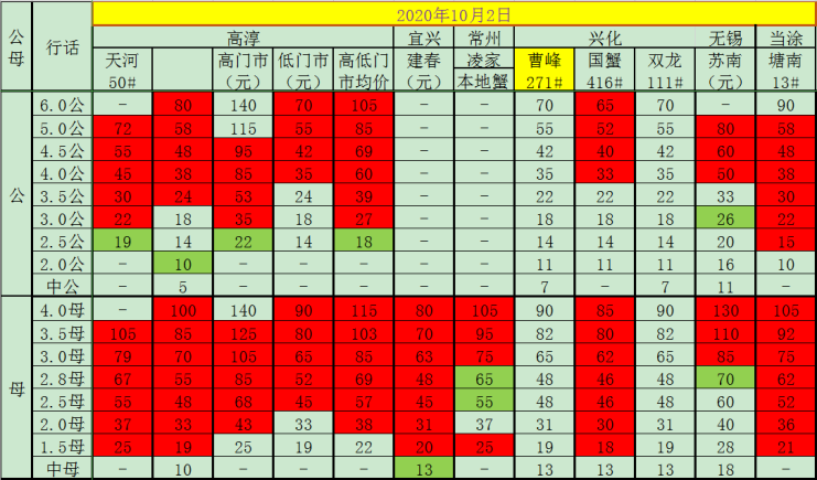 今日(2020.10.2)成蟹报价,各位老板根据情况选择销售。绿色标记为较前一日增长,红色标记为较前一日下跌。