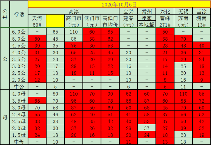 今日(2020.10.6)成蟹报价,各位老板根据情况选择销售。绿色标记为较前一日增长,红色标记为较前一日下跌。