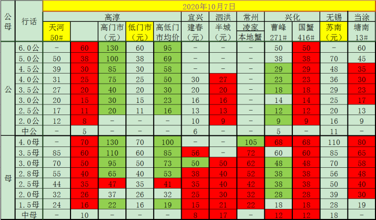 今日(2020.10.7)成蟹报价,各位老板根据情况选择销售。绿色标记为较前一日增长,红色标记为较前一日下跌。
