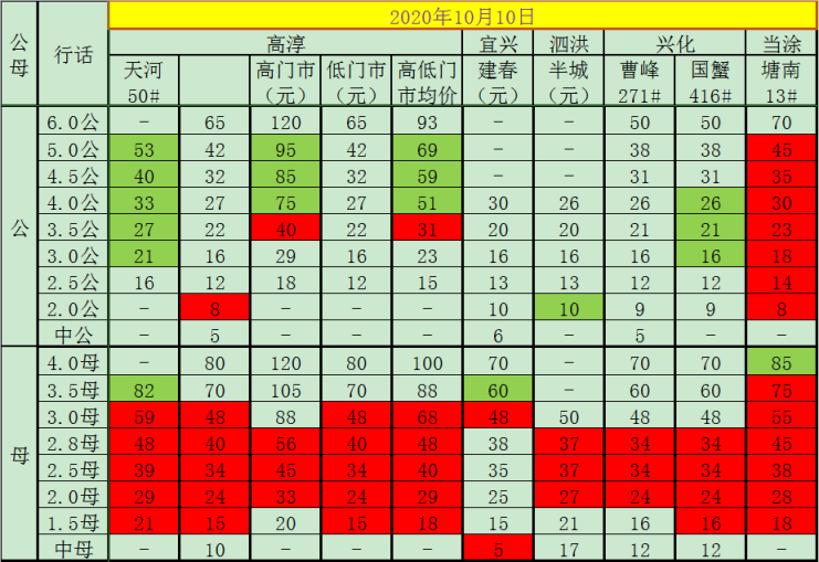 今日(2020.10.10)成蟹报价,各位老板根据情况选择销售。绿色标记为较前一日增长,红色标记为较前一日下跌。