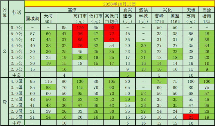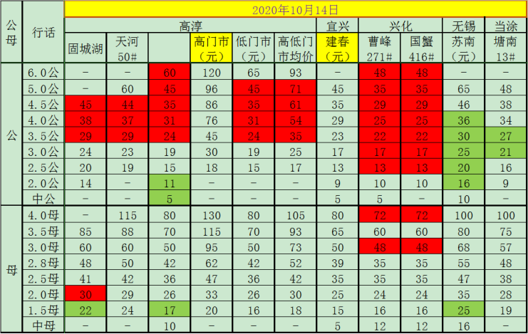 今日(2020.10.14)成蟹报价,各位老板根据情况选择销售。绿色标记为较前一日增长,红色标记为较前一日下跌。