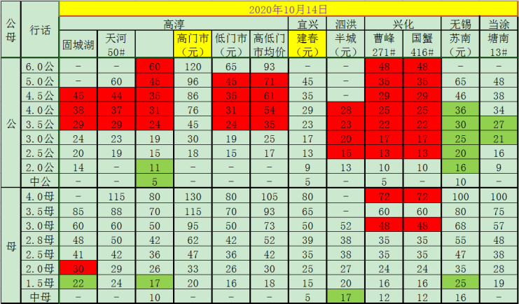 今日(2020.10.15)成蟹报价,各位老板根据情况选择销售。绿色标记为较前一日增长,红色标记为较前一日下跌。
