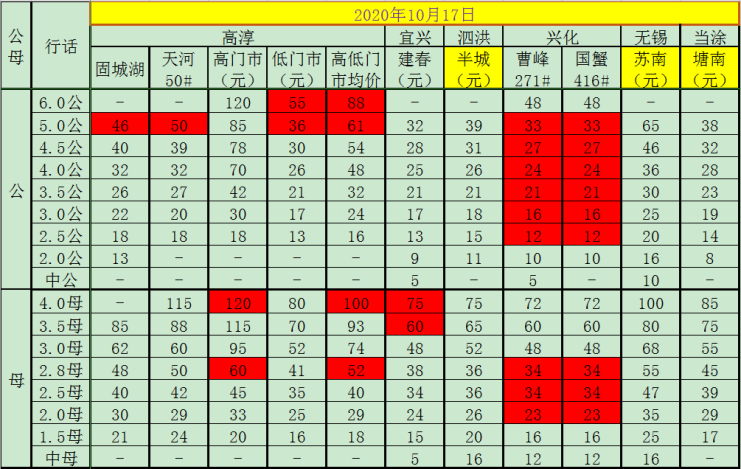 今日(2020.10.18)成蟹报价,各位老板根据情况选择销售。绿色标记为较前一日增长,红色标记为较前一日下跌。