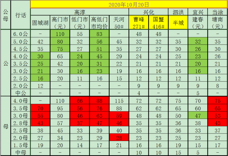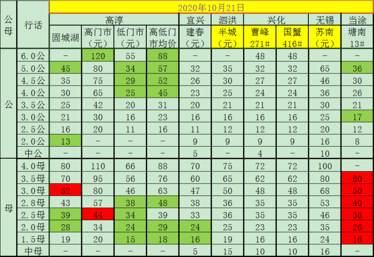 今日(2020.10.21)成蟹报价,各位老板根据情况选择销售。绿色标记为较前一日增长,红色标记为较前一日下跌。