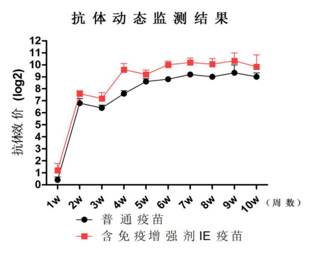 右图为NDV HI抗体效价动态监测结果,免疫增强剂IE在疫苗免疫初期能较早的促进特异性保护抗体产生,并维持较高的抗体滴度。