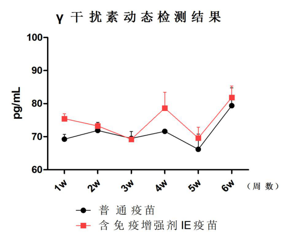 左图为γ干扰素动态检测结果,在鸡的外周血γ干扰素含量这一指标中,含免疫增强剂IE组的动态含量除第3周外,均高于普通疫苗组相应点的检测含量。