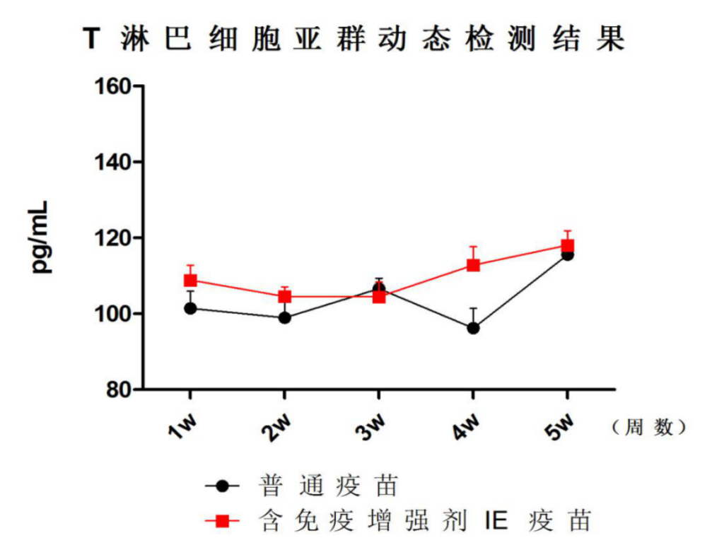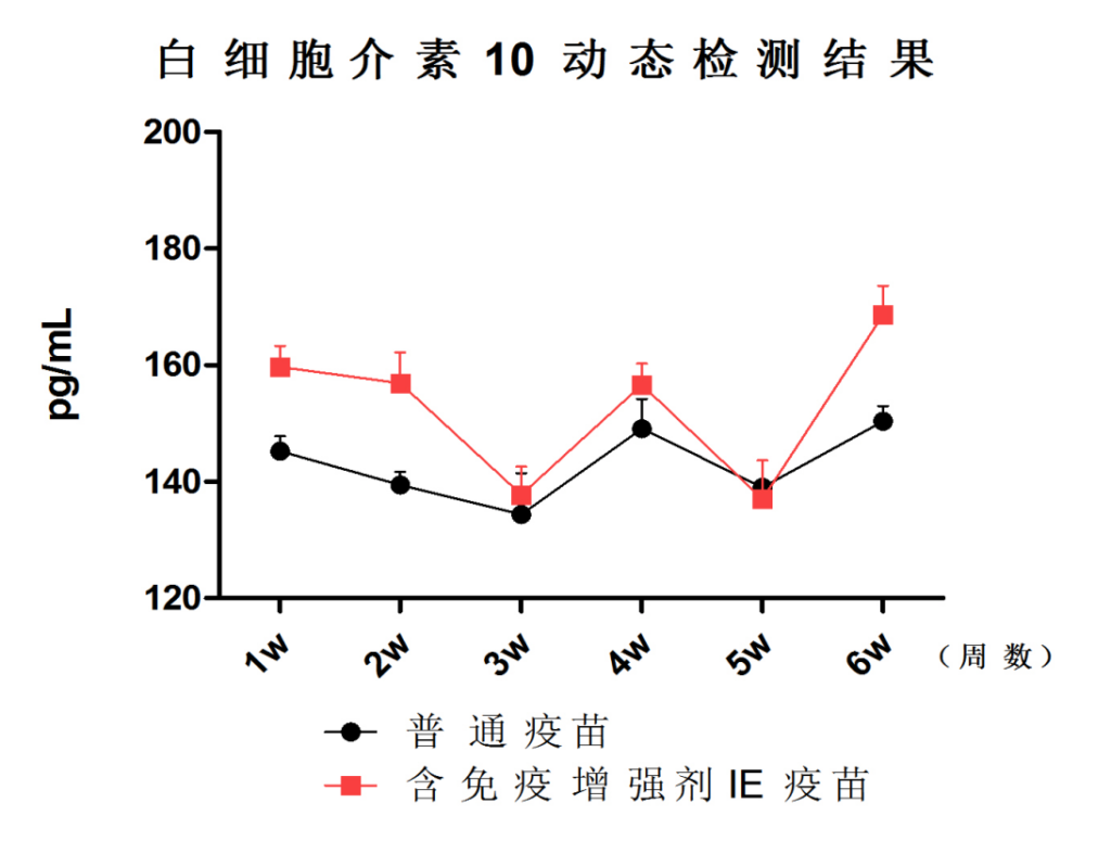 左图为白细胞介素10动态检测结果,在鸡的外周血的白细胞介素10含量这一指标中,含免疫增强剂IE组的IL-10动态含量除第5周外,均高于普通疫苗组相应点的检测含量。
