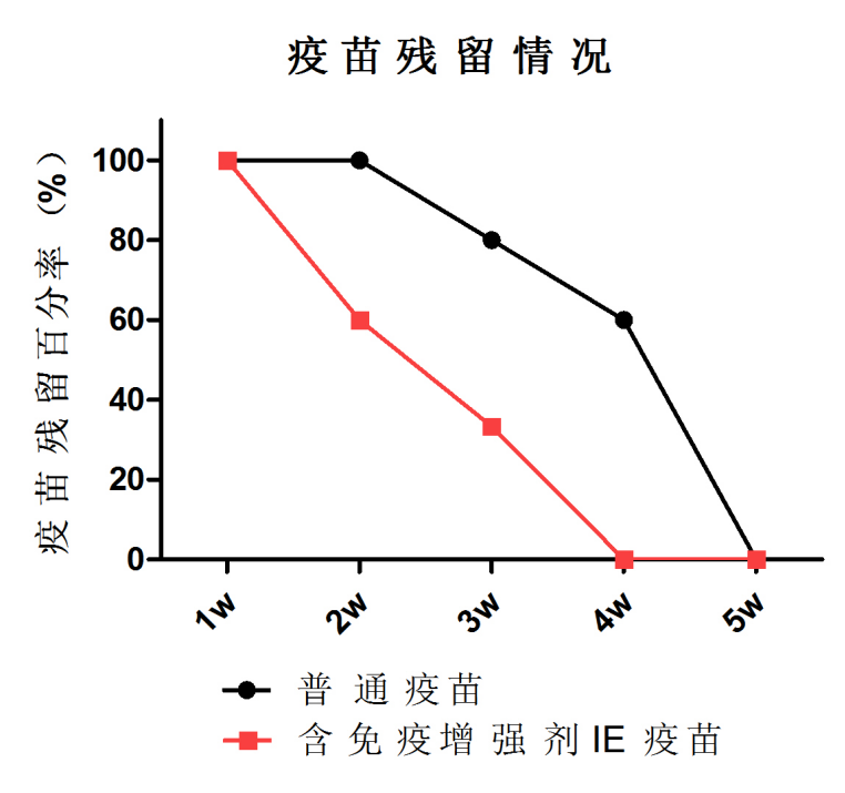 右图为免疫增强剂对疫苗吸收的对比结果,添加免疫增强剂IE组自第2周开始出现明显吸收,普通疫苗组在第3周开始出现明显吸收,含免疫增强剂IE组疫苗吸收情况明显优于普通疫苗组。